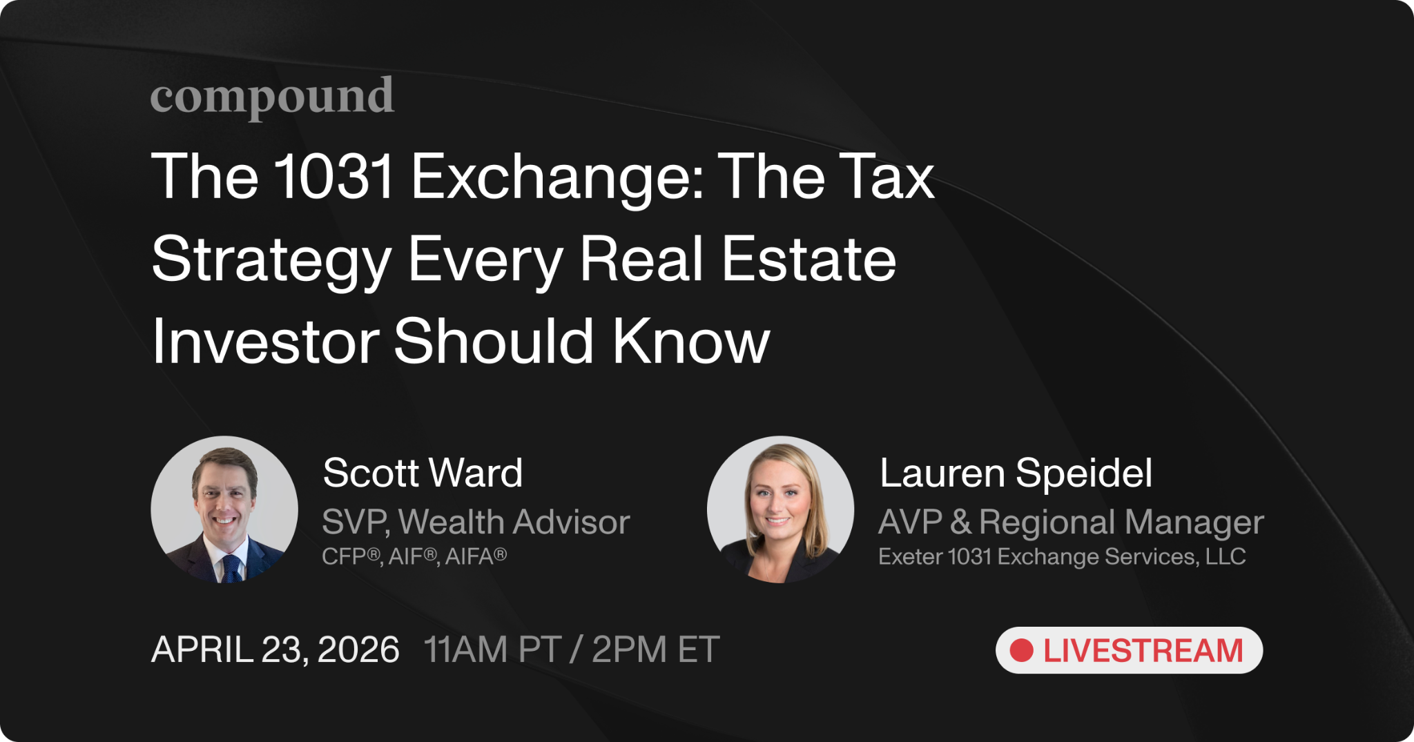 Scott Ward, CFP®, AIF®, AIFA®, is a SVP, Wealth Advisor at Compound, where he specializes in helping real estate owners navigate 1031 exchanges to defer capital gains and maximize long-term wealth. He also advises executives and skilled professionals on retirement-transition strategies, executive benefits, portfolio management, and tax-smart planning for liquidity events.