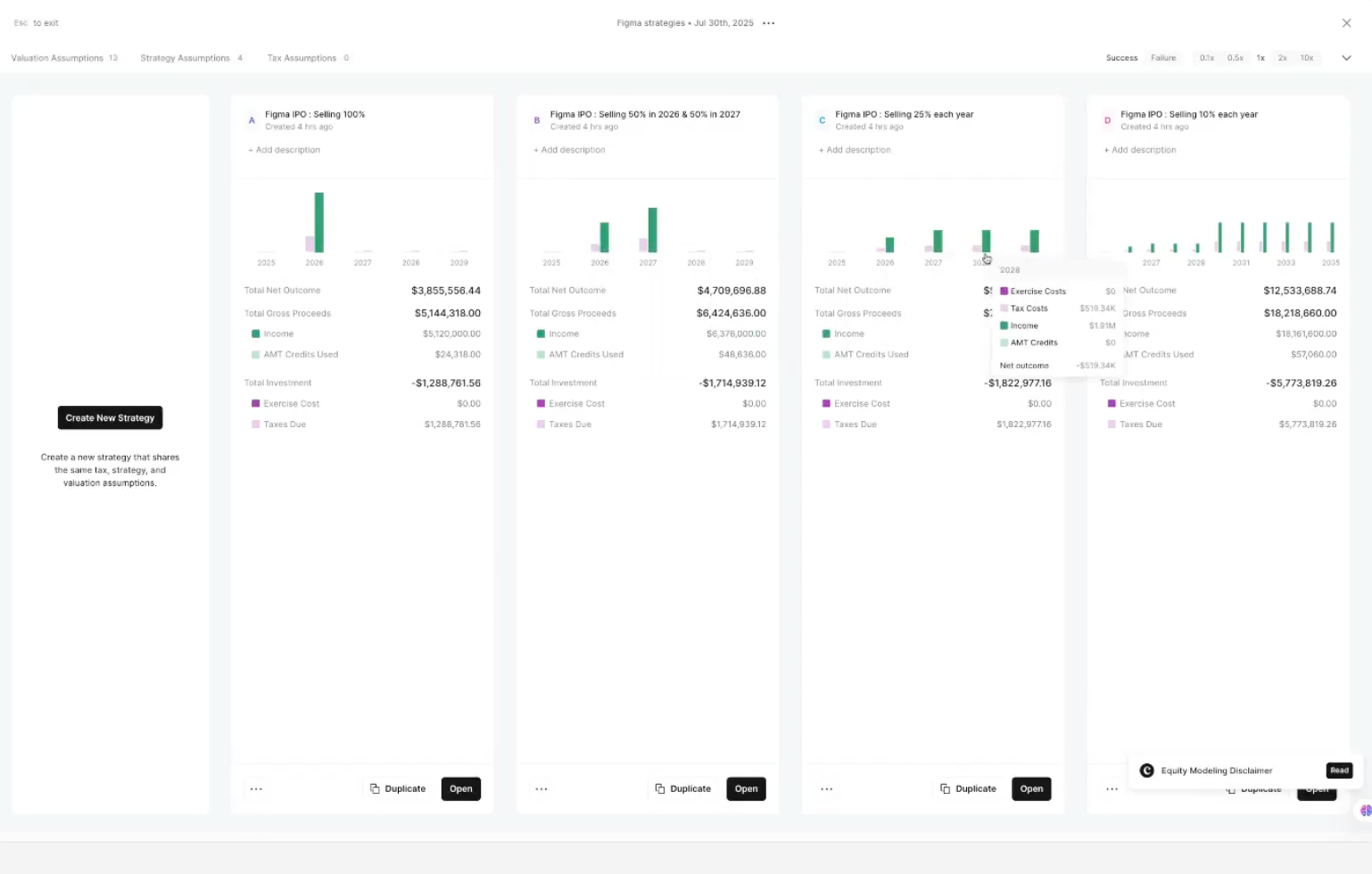 Compound’s equity simulator tool can be really powerful for visualization. A complex conversation around taxes and various strategies can feel intangible at first. However, a side-to-side view of “This is what could happen if everything goes well, and this is if things don’t go according to plan,” can help ground your decision. It begs you to answer the question: Are you able and willing to sustain this downside scenario?”